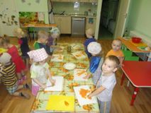 Маленькие хозяюшки и мамины помощники очень ответственно отнеслись к процессу - ребята сами чистили и крошили овощи. Данный вид деятельности хорошо развивает мелкую моторику и благотворно влияет на психологическое состояние ребенка. Все остались довольны, и с удовольствием попробовали салат, приготовленный своими ручками.